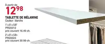 This promotion is available in various stores, view all products to get the cheapest TABLETTE DE MÉLAMINE. If you'd like to find out whether this product has a bigger discount in another store, check the category 'DIY'. You may also find these offers interesting: PANNEAU DE MÉLAMINE, TABLETTE GRILLAGÉE 12 & TABLETTE GRILLAGÉE.