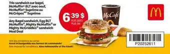 The Any Bagel sandwich, Egg BLT McMuffin , Mighty McMuffin or Mighty McGriddles sandwich Meal Deal is available this week at McDonald's with a valuable discount. On this page, you will find details about the current promotional price, the promotion terms, and any special discounts. You can also explore other related deals and promotions for Any Bagel sandwich, Egg BLT McMuffin , Mighty McMuffin or Mighty McGriddles sandwich Meal Deal to make sure you get the best value.