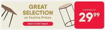 This promotion is available in various stores, view all products to get the cheapest SHOP ACCENT TABLES. If you'd like to find out whether this product has a bigger discount in another store, check the category 'Home and Furniture'. You may also find these offers interesting: Night Tables, PORTMAN Pine occasional tables & Asst. folding tray tables.