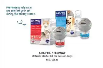 The price of ADAPTIL/FELIWAY Diffuser starter Kit for cats or dogs can be found at the top of the page, together with the dates during which the offer is available. You can also check the price in the current Mondou flyer or on the Mondou website. Promotional offers assure you of buying Mondou products at the lowest price.