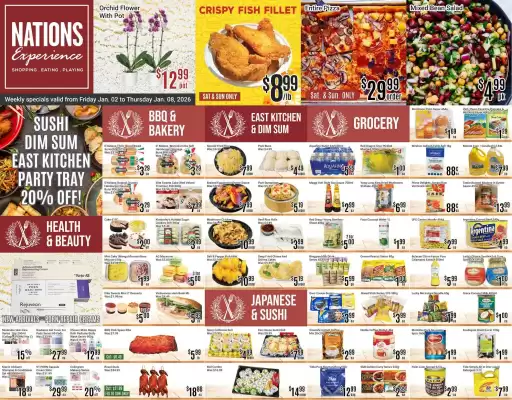 You can find this week’s latest Nations Fresh Foods Flyer at the top of this page. This Nations Fresh Foods flyer, valid from 05-01-2026 to 08-01-2026, shows the complete overview of the current promotional flyers from Nations Fresh Foods. Here you can see how many pages the flyer contains and how long it will remain valid. The information has been verified by Nations Fresh Foods and applies to stores in Brampton, Calgary and Edmonton.