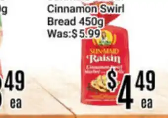 This promotion is available in various stores, view all products to get the cheapest Cinnamon Swirl Bread. If you'd like to find out whether this product has a bigger discount in another store, check the category 'Grocery'. You may also find these offers interesting: CINNABON Cinnamon Bread or SUNMAID Raisin Bread, CINNAMON BUN PULL-APART BREAD & CINNAMON.