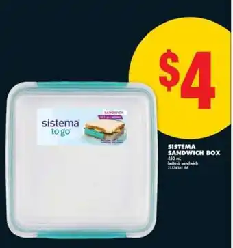 This promotion is available in various stores, view all products to get the cheapest SISTEMA SANDWICH BOX. If you'd like to find out whether this product has a bigger discount in another store, check the category 'Grocery'. You may also find these offers interesting: SISTEMA SANDWICH BOX, 450 mL, Sistema To-Go 18-Pc Set & SISTEMA DRESSING TO GO, 4's.