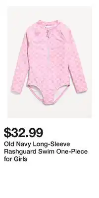 Current Old Navy Long-Sleeve Rashguard Swim One-Piece for Girls deal at Old Navy from 19-01 until 25-01.
