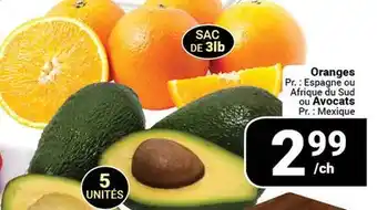 Oranges Pr. Espagne ou Afrique du Sud ou Avocats Pr. : Mexique