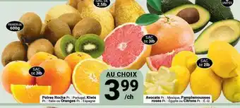 Poires Rocha, Kiwis, Oranges, Avocats, Pamplemousses, roses ou Citrons