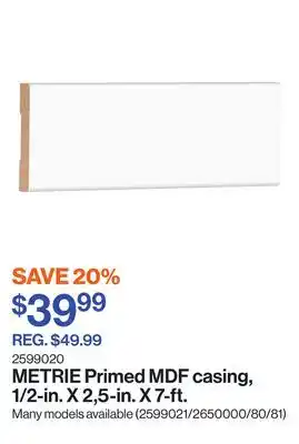 This promotion is available in various stores, view all products to get the cheapest Primed MDF casing, 1/2-in. X 2,5-in. X 7-ft. If you'd like to find out whether this product has a bigger discount in another store, check the category 'Kitchen and Bathroom'. You may also find these offers interesting: ALEXANDRIA MOULDING 1/2 x 3-1/2 x 96 MDF Primed Fibreboard, 10-pack flat casings Primed MDF & TRUPORTE 48 x 80-1/2 MDF Sliding Closet door.