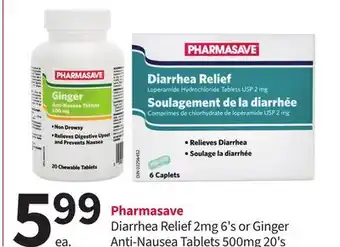 Pharmasave Diarrhea Relief 2mg 6's or Ginger Anti-Nausea Tablets 500mg 20's promotion at Pharmasave