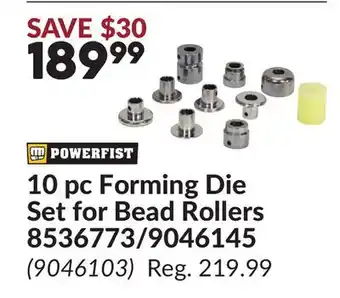 The price of 10 pc Forming Die Set for Bead Rollers 8536773/9046145 can be found at the top of the page, together with the dates during which the offer is available. You can also check the price in the current Princess Auto flyer or on the Princess Auto website. Promotional offers assure you of buying Princess Auto products at the lowest price.