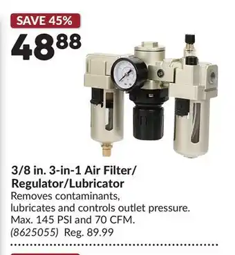 The 3/8 in. 3-in-1 Air Filter/ Regulator/Lubricator is currently available at a discount at Princess Auto. On this page, you will find all the details about the current price, the promotion terms, and the validity period. You can also explore comparable deals and promotions for 3/8 in. 3-in-1 Air Filter/ Regulator/Lubricator to make the most cost-effective choice.