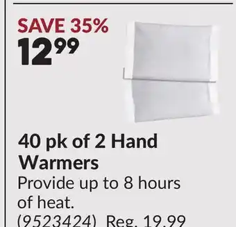 This promotion is available in various stores, view all products to get the cheapest 40 pk of 2 Hand Warmers. If you'd like to find out whether this product has a bigger discount in another store, check the category 'DIY'. You may also find these offers interesting: 40 pk Hand Warmers, Grabber Warmers or Hand Warmers & Hand Warmers.