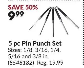 This 5 pc Pin Punch Set promotion is valid in week 09. If it has expired, you can still view other available offers. Following the product category will keep you updated whenever 5 pc Pin Punch Set is on sale again at Princess Auto as part of a new promotion or discount.