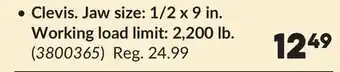 The price of Clevis. Jaw size: 1/2 x 9 in. Working load limit: 2,200 lb can be found at the top of the page, together with the dates during which the offer is available. You can also check the price in the current Princess Auto flyer or on the Princess Auto website. Promotional offers assure you of buying Princess Auto products at the lowest price.