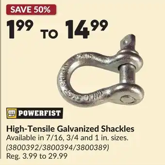 This High-Tensile Galvanized Shackles is now on sale at Princess Auto. Check the current selection filled with great deals and discounts. Purchase High-Tensile Galvanized Shackles online via Princess Auto website or get it at the best available price in person. Flyerdeals.ca gathers the best High-Tensile Galvanized Shackles promotions for you. Click on the bell icon to receive a free notification when this product is on sale again.High-Tensile Galvanized Shackles promotions for next week