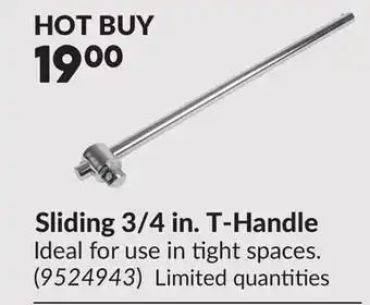 This Sliding 3/4 in. T-Handle is now on sale at Princess Auto. Check the current selection filled with great deals and discounts. Purchase Sliding 3/4 in. T-Handle online via Princess Auto website or get it at the best available price in person. Flyerdeals.ca gathers the best Sliding 3/4 in. T-Handle promotions for you. Click on the bell icon to receive a free notification when this product is on sale again.Sliding 3/4 in. T-Handle promotions for next week
