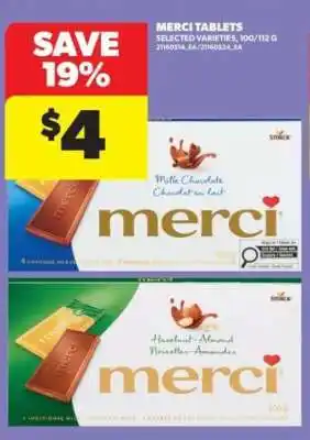 This promotion is available in various stores, view all products to get the cheapest Merci Tablets. If you'd like to find out whether this product has a bigger discount in another store, check the category 'Grocery'. You may also find these offers interesting: MERCI TABLETS, 100/112 G, MERCI CHOCOLATES & MERCI Assorted chocolates, 200g.
