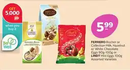 FERRERO Rocher or Collection Milk, Hazelnut or White Chocolate Eggs 90g-100g or LINDT Mini Eggs 100g