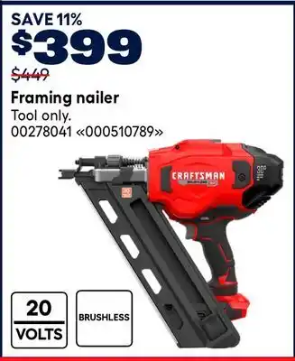 Many people prepare their shopping list in advance, using the latest deals and promotions. Flyerdeals.ca is among the first to share next week’s promotions, so you know whether to wait before making a purchase or buy right away at the best price. Our team updates all CRAFTSMAN Framing nailer promotions quickly, allowing you to plan with both this week’s and next week’s offers. Some promotions are only available during specific dates or online.Frequently asked questions about CRAFTSMAN Framing nailer
