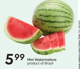 The price of Mini Watermelons can be found at the top of the page, together with the dates during which the offer is available. You can also check the price in the current Sobeys flyer or on the Sobeys website. Promotional offers assure you of buying Sobeys products at the lowest price.