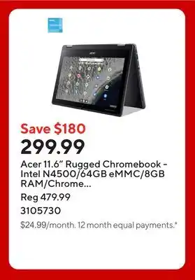 The price of Acer 11.6 Rugged Chromebook - Intel N4500/64GB eMMC/8GB RAM/Chrome OS with 3 months of Google AI Pro can be found at the top of the page, together with the dates during which the offer is available. You can also check the price in the current Staples flyer or on the Staples website. Promotional offers assure you of buying Staples products at the lowest price.