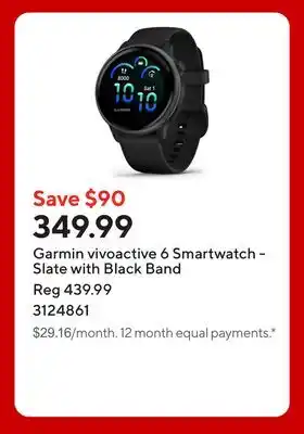 The price of Garmin vivoactive 6 Smartwatch - Slate with Black Band can be found at the top of the page, together with the dates during which the offer is available. You can also check the price in the current Staples flyer or on the Staples website. Promotional offers assure you of buying Staples products at the lowest price.