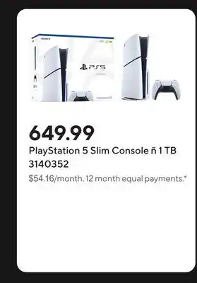 This PlayStation 5 Slim Console ñ 1 TB is now on sale at Staples. Check the current selection filled with great deals and discounts. Purchase PlayStation 5 Slim Console ñ 1 TB online via Staples website or get it at the best available price in person. Flyerdeals.ca gathers the best PlayStation 5 Slim Console ñ 1 TB promotions for you. Click on the bell icon to receive a free notification when this product is on sale again.PlayStation 5 Slim Console ñ 1 TB promotions for next week