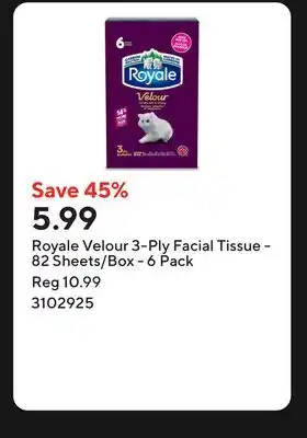 Now on sale at Staples: Royale Velour 3-Ply Facial Tissue - 82 Sheets/Box ✅ Valid from 20-02 to 26-02.