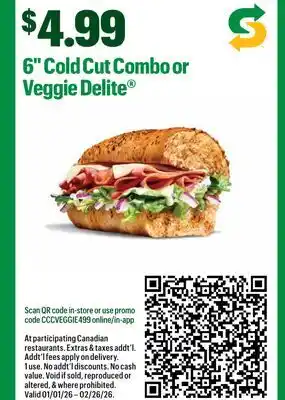 Current 6 Cold Cut Combo or Veggie Delite deal at Subway from 2-01 until 12-02.
