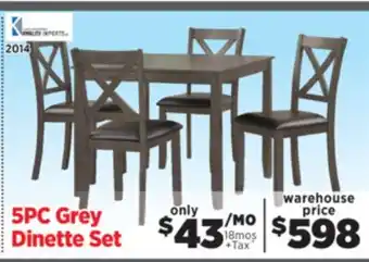 This Julio Grey 5-Piece Dinette Set promotion is valid in week 05. If it has expired, you can still view other available offers. Following the product category will keep you updated whenever Julio Grey 5-Piece Dinette Set is on sale again at Surplus Furniture as part of a new promotion or discount.