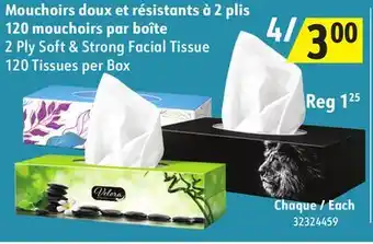 This promotion is available in various stores, view all products to get the cheapest 2 Ply Soft & Strong Facial Tissue 120 Tissues per Box. If you'd like to find out whether this product has a bigger discount in another store, check the category 'Grocery'. You may also find these offers interesting: Royale Original 2-Ply Facial Tissues - 18 Flat Boxes - 126 Tissues per Box, Royale Velour 3-Ply Facial Tissue - 82 Sheets/Box & ROYALE ORIGINAL 2-Ply (126) or VELOUR 3-Ply (82) Facial Tissues.