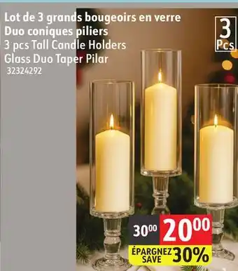 This promotion is available in various stores, view all products to get the cheapest 3 pcs Tall Candle Holders Glass Duo Taper Pilar. If you'd like to find out whether this product has a bigger discount in another store, check the category 'Grocery'. You may also find these offers interesting: 3 pcs Tall Candle Holders Glass, Duo Candle 16 Oz & 2/3 Pcs LED Candle Sets.