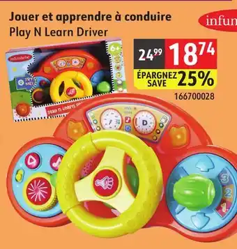 This promotion is available in various stores, view all products to get the cheapest Play N Learn Driver. If you'd like to find out whether this product has a bigger discount in another store, check the category 'Grocery'. You may also find these offers interesting: Play-Doh Drill 'n Fill Dentist Playset, Baguette à bulles Play Day & Harmony Play & Go Luxury Play Yard - Grey.