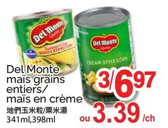 DEL MONTE MAÏS GRAINS ENTIERS/ MAÏS EN CRÈME, 341ML,398ML offer at T&T Supermarket