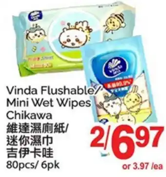 Now on sale at T&T Supermarket: VINDA FLUSHABLE/MINI WET WIPES CHIKAWA, 80PCS ✅ Valid from 20-02 to 26-02.