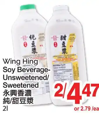 WING HING SOY BEVERAGE-UNSWEETENED/ SWEETENED, 2L promotion at T&T Supermarket