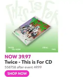 Many people prepare their shopping list in advance, using the latest deals and promotions. Flyerdeals.ca is among the first to share next week’s promotions, so you know whether to wait before making a purchase or buy right away at the best price. Our team updates all Twice - This is For CD promotions quickly, allowing you to plan with both this week’s and next week’s offers. Some promotions are only available during specific dates or online.Frequently asked questions about Twice - This is For CD