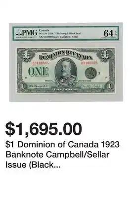 This promotion is available in various stores, view all products to get the cheapest $1 Dominion of Canada 1923 Banknote Campbell/Sellar Issue (Black Seal) PMG Certified Choice. If you'd like to find out whether this product has a bigger discount in another store, check the category 'Department Stores'. You may also find these offers interesting: 1959 Choice Uncirculated Silver Dollar, ICCS Certified MS-64, 1958 Choice Uncirculated Silver Dollar ICCS Certified MS-64 & Canada Pooch Black Suspender Boots.
