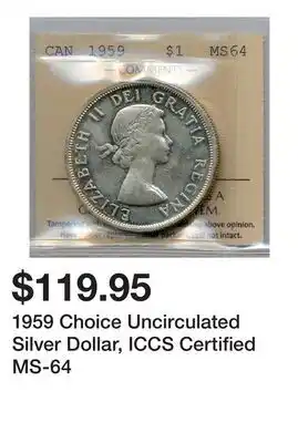 The 1959 Choice Uncirculated Silver Dollar, ICCS Certified MS-64 is available this week at TSC Stores with a valuable discount. On this page, you will find details about the current promotional price, the promotion terms, and any special discounts. You can also explore other related deals and promotions for 1959 Choice Uncirculated Silver Dollar, ICCS Certified MS-64 to make sure you get the best value.