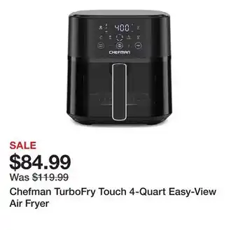 This promotion is available in various stores, view all products to get the cheapest Chefman TurboFry Touch 4-Quart Easy-View Air Fryer. If you'd like to find out whether this product has a bigger discount in another store, check the category 'Department Stores'. You may also find these offers interesting: 5.7 L TurboFry Dual Basket Air Fryer, Air Fryer & Multifunctional Air Fryer.