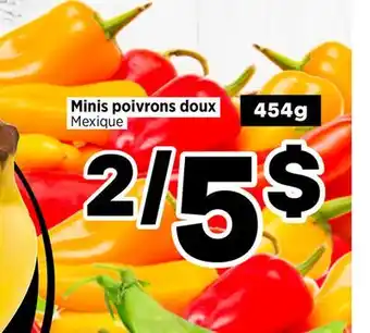 This promotion is available in various stores, view all products to get the cheapest Minis poivrons doux Mexique. If you'd like to find out whether this product has a bigger discount in another store, check the category 'Grocery'. You may also find these offers interesting: POIVRONS DOUX DÉLICES DU MARCHÉ, 4 UN, MINI POIVRONS DOUX | SWEET MINI PEPPERS, 454 G, 1 LB & POIVRONS DOUX JAUNE, ORANGE ET ROUGE | YELLOW, ORANGE AND RED SWEET PEPPERS.