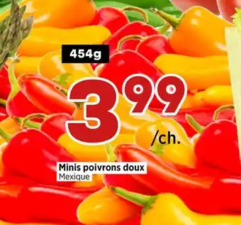 This promotion is available in various stores, view all products to get the cheapest Minis poivrons doux. If you'd like to find out whether this product has a bigger discount in another store, check the category 'Grocery'. You may also find these offers interesting: Poivrons doux assortis, Mini poivrons doux | sweet mini peppers & POIVRONS DOUX DÉLICES DU MARCHÉ, 4 un.