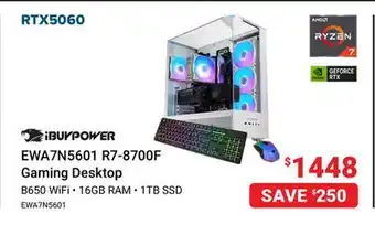 The EWA7N5601 R7-8700F Gaming Desktop is available this week at Visions Electronics with a valuable discount. On this page, you will find details about the current promotional price, the promotion terms, and any special discounts. You can also explore other related deals and promotions for EWA7N5601 R7-8700F Gaming Desktop to make sure you get the best value.