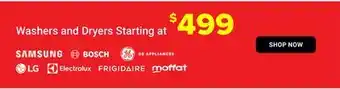 This promotion is available in various stores, view all products to get the cheapest Washers and Dryers Starting at $499. If you'd like to find out whether this product has a bigger discount in another store, check the category 'Electronics'. You may also find these offers interesting: Microwaves Starting at $114, Dishwashers Starting at $495 & Seed Starting Mix.
