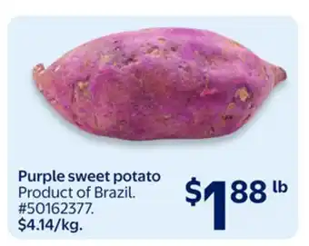 Walmart offers a wide collection of products, besides the Purple sweet potato. Keep an eye on the weekly Walmart flyer to find the best offers and promotions. Besides Purple sweet potato, you can also find the following offers: Purple or White Flesh Sweet Potato Product of Ontario Canada No. 1, Purple or White Flesh Sweet Potato Product of Ontario Canada No. 1, 3.26/kg & PATATES DOUCES | SWEET POTATO.