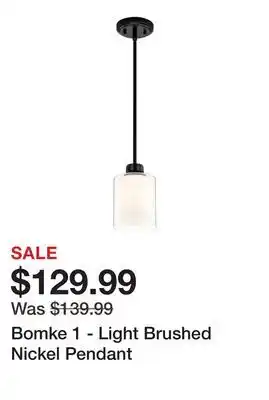 The Bomke 1 - Light Brushed Nickel Pendant is available this week at Wayfair with a valuable discount. On this page, you will find details about the current promotional price, the promotion terms, and any special discounts. You can also explore other related deals and promotions for Bomke 1 - Light Brushed Nickel Pendant to make sure you get the best value.