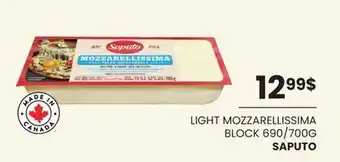 This promotion is available in various stores, view all products to get the cheapest LIGHT MOZZARELLISSIMA BLOCK, 690/700G. If you'd like to find out whether this product has a bigger discount in another store, check the category 'Wholesale'. You may also find these offers interesting: FROMAGE RÂPÉ MOZZARELLISSIMA, SAPUTO MOZZARELLISSIMA & FROMAGE MOZZARELLISSIMA SAPUTO | SAPUTO MOZZARELLISSIMA CHEESE.